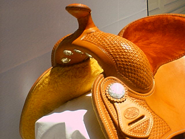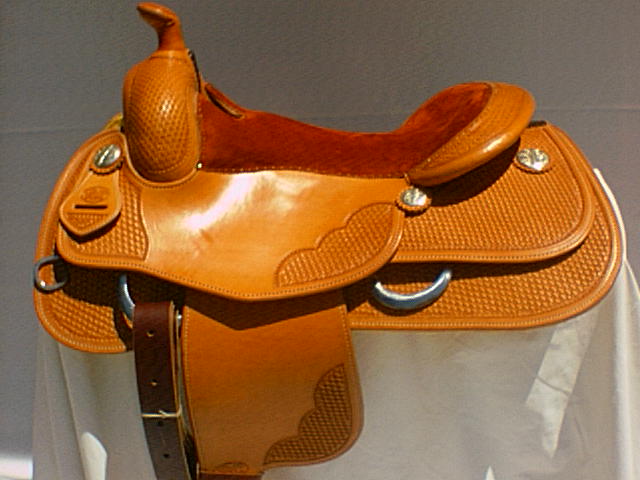 Bob’s Custom Saddles 15.5" DL Reiner. Same as Product #18 with sterling conchos, standard size butterfly skirts, and basket weave tooling.