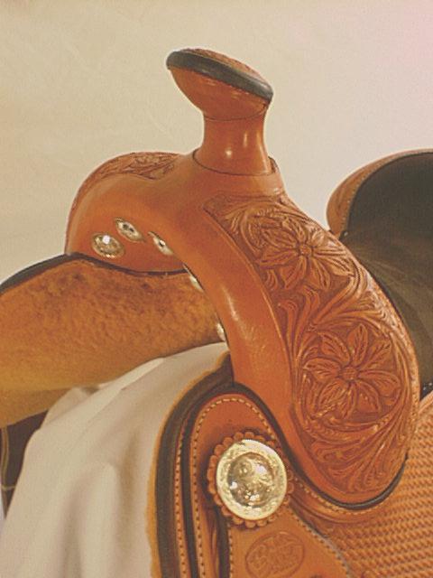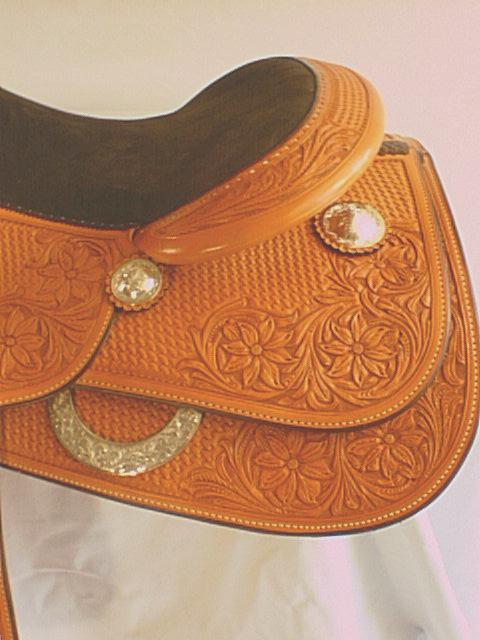 Bob’s 15.5” Reining Saddle; Built on a 16” tree with double padded seat and butterfly skirts, this saddle can be finished with the stirrups of choice. Distinctive tooling pattern and flat topped sterling silver conchos, provide an elegant finish.