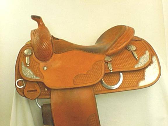 Bob’s 16” Show Saddle. In very good condition this saddle features 6 sterling overlay corner plates, sterling conchos and long tips. Close contact skirt rigging.