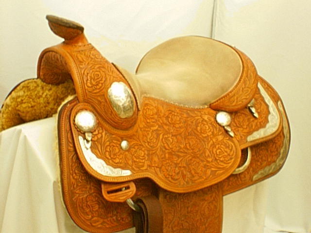 Fine condition sterling mounted show saddle from Broken Horn. Sterling corner plates, cantle plate, pommel plate, conchos and tips.