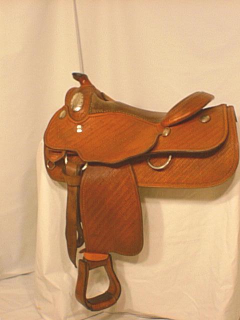 Here's the chance to pick up on a great riding Blue Ribbon for work or as a low price top quality show saddle. Nice condition with sterling conchos and pommel plates. Note tip of riata strap on right pommel plate is missing.