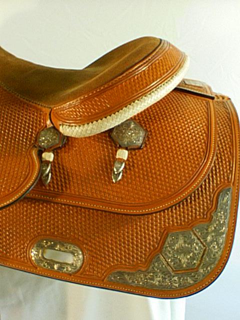 overlay corner plates, conchos, and swell caps, with braided rawhide trim on the