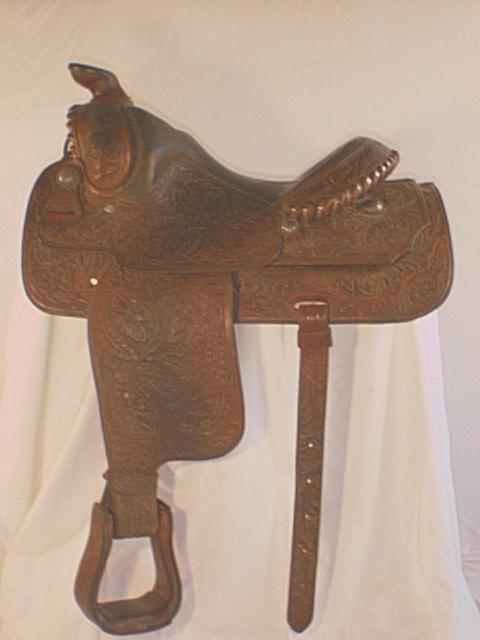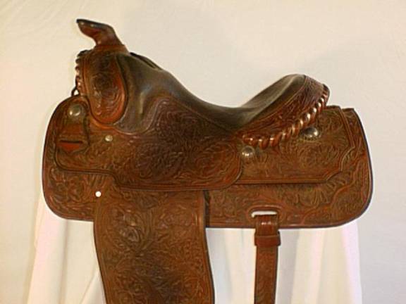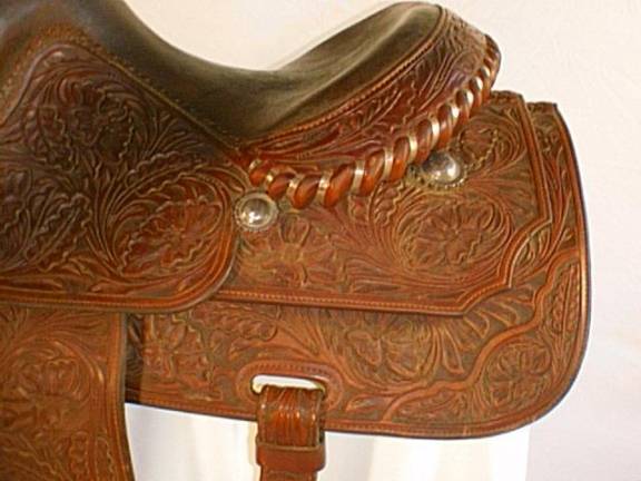 Champion 16” California Equitation Saddle; A real bargain, this one is hand tooled with sterling conchos. Also included are braided hobbles with silver pieces and flank cinch. Very fine condition.
