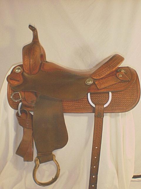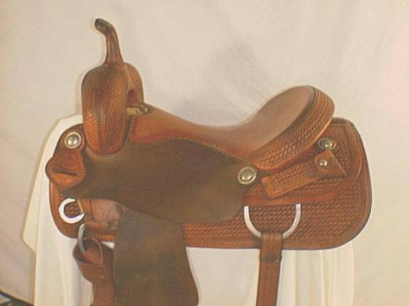 M.L. Leddy 16” ½ Breed Padded Seat Cutter; Cutting Saddle; A very nice condition cutting saddle with ½ breed basket stamp/rough out finish. Oxbow stirrups, padded seat, and flank cinch complete this fine traditional offering.