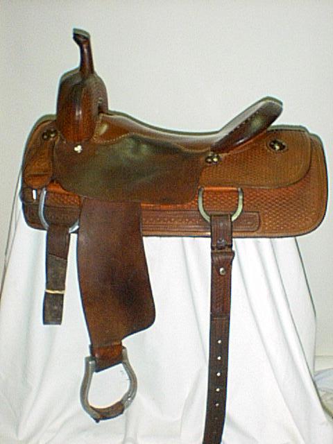 H & H 16.5” Half Breed basket stamped cutter. In great condition this cutter has oxidized “card suit” conchos, cast aluminum stirrups and a deep pocket seat.