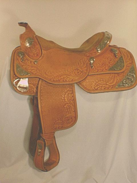 Dale Chavez 16.5” Show Saddle. In fine condition and featuring the narrow seat and competitive pricing that makes Chavez’ saddles popular. Full silver cantle, three sets of corner plates, pommel plates, silver conchso and tips.