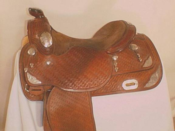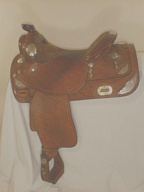 Kathy’s 15.5” Dark Oil Show Saddle; Featuring wave pattern tooling and sterling silver overlay accents this saddle has had very little use and is bargain priced! Equitation seat and sterling mounted stirrups. $975.00