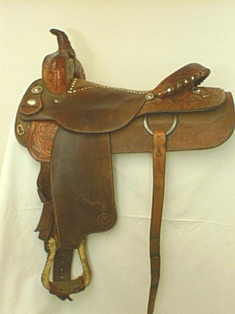 Circle Y 16.5” Cutter. In very good riding condition this older Circle Y with half breed rough out, floral tooling has years of service left in it. Leather wrapped horn.