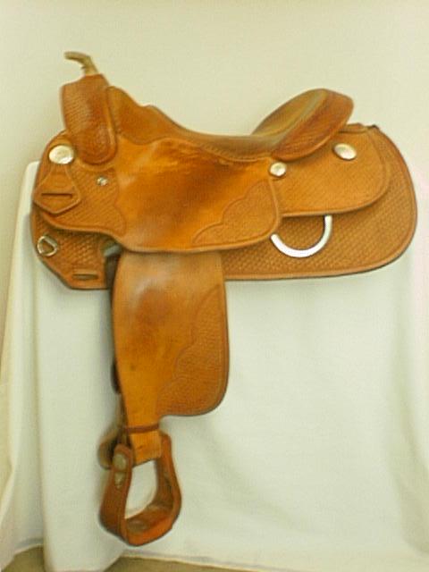 Jim Taylor 16” Bob Loomis model Reiner. Used only for a show saddle, this saddle features a rawhide braided horn, flat plate 3 ring rigging, and deep seat.