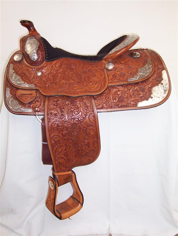 Bob’s 16” Used Show Saddle. Huge silver swell caps, 4 sets of sterling corner plates, sterling conchos,. Full one piece silver cantle and fully floral tooled.