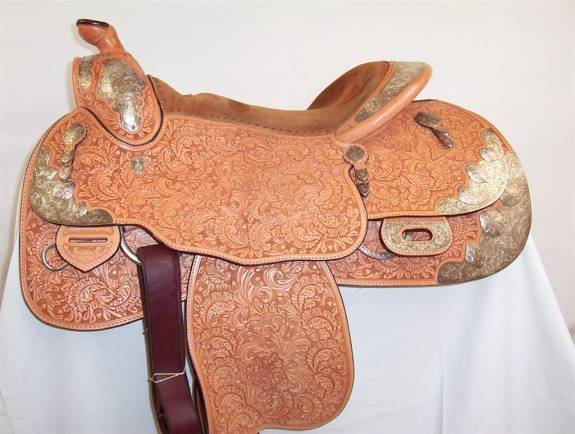 Blue Ribbon 15.5” New condition Show Saddle. For anyone who want an absolutely new condition used saddle, here it is. Triple cloud silver pattern trimmed to the edge of the skirts. Close contact cutup skirts. Fully Entz floral tooled. Beautiful.