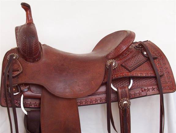 16.5” Calvin Allen Half Breed Rough Out, Hardseat Show Cutter; In mint condition, this saddle features beaded rosettes, saddle strings “star” pattern border and Calvin Allen’s fine custom hand workmanship.
