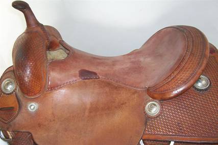 stamped, and includes flank cinch. Note oil stain on seat, accomplished through
