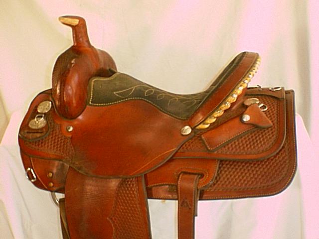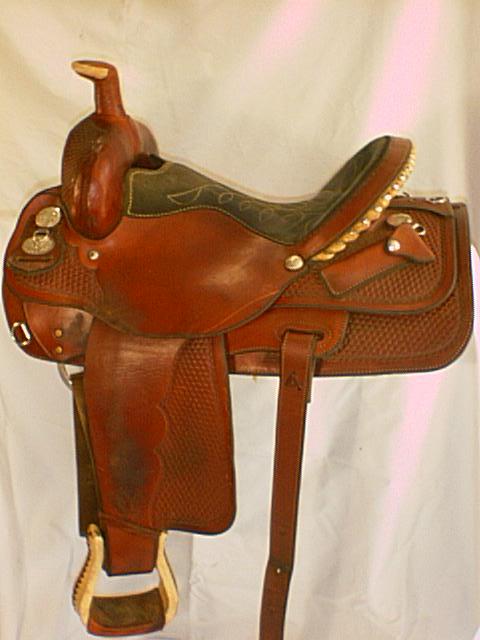 this saddle has a wood tree, reinforced rigging, dally horn, and double stirrup